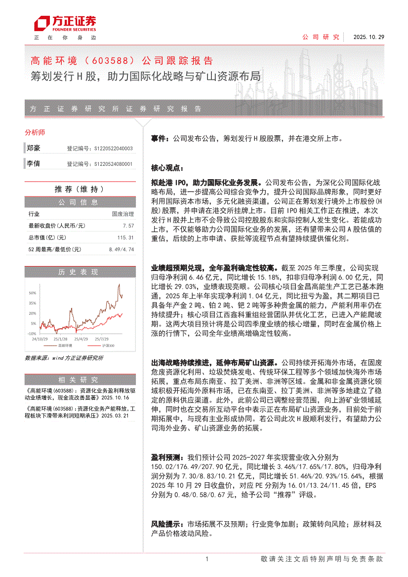 高能环境:方正证券-高能环境-603588-公司跟踪报告:筹划发行H股,助力国际化战略与矿山资源布局-251029
