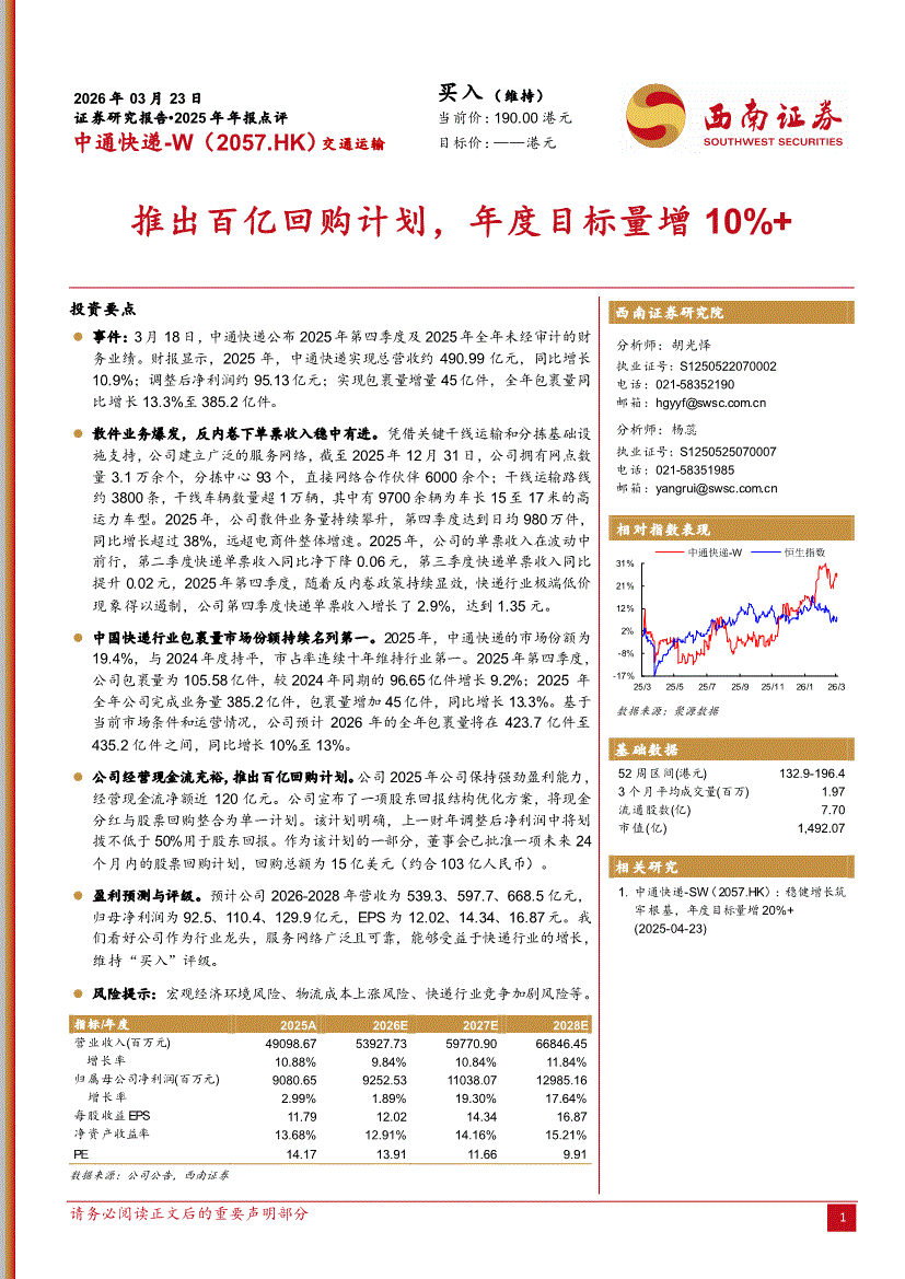中通快递~W:西南证券-中通快递~W-2057.HK-2025年年报点评:推出百亿回购计划,年度目标量增10%+-260323