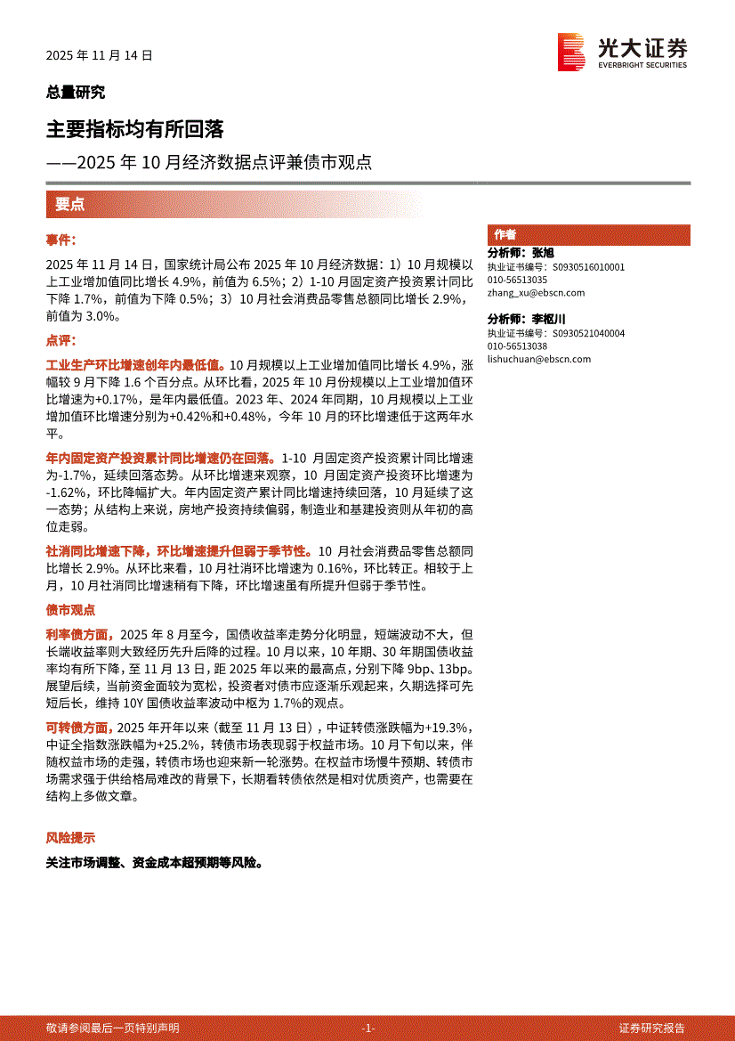 光大证券-2025年10月经济数据点评兼债市观点:主要指标均有所回落-251114
