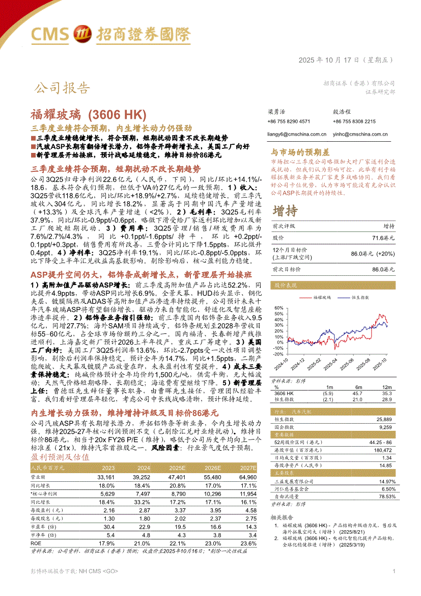 福耀玻璃:招商证券(香港)-福耀玻璃-3606.HK-三季度业绩符合预期,内生增长动力仍强劲-251017