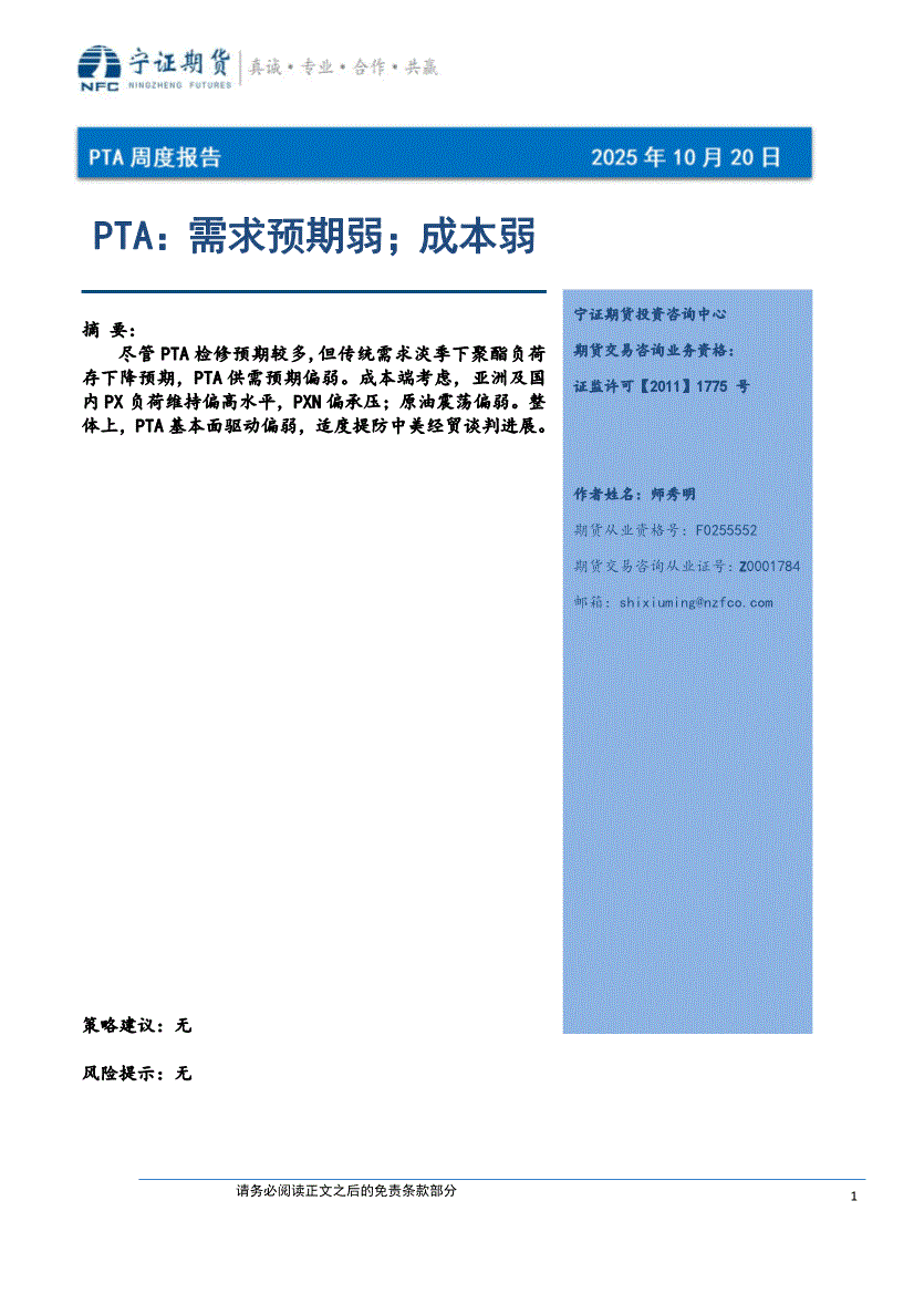 宁证期货-PTA周度报告:需求预期弱;成本弱-251020