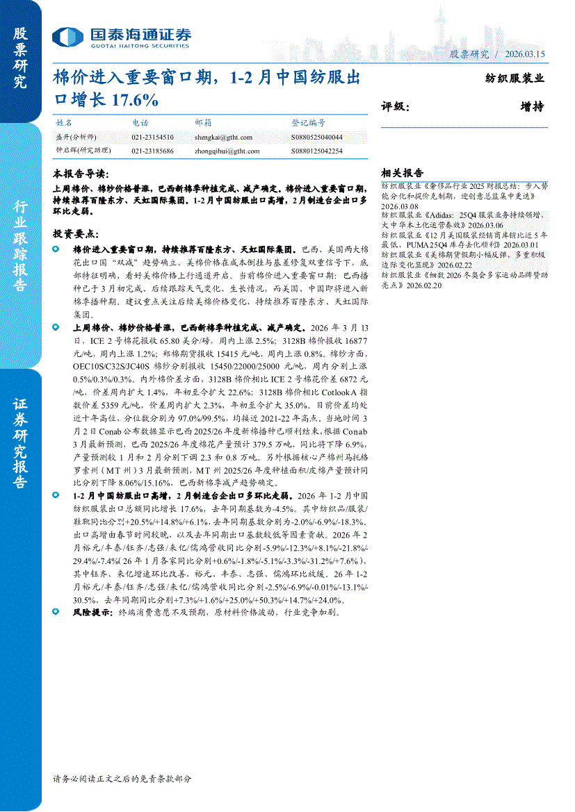 纺织服装行业:国泰海通证券-纺织服装行业:棉价进入重要窗口期,1~2月中国纺服出口增长17.6%-260315