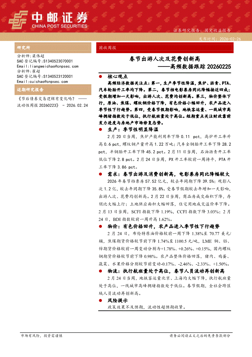 中邮证券-高频数据跟踪:春节出游人次及花费创新高-260226