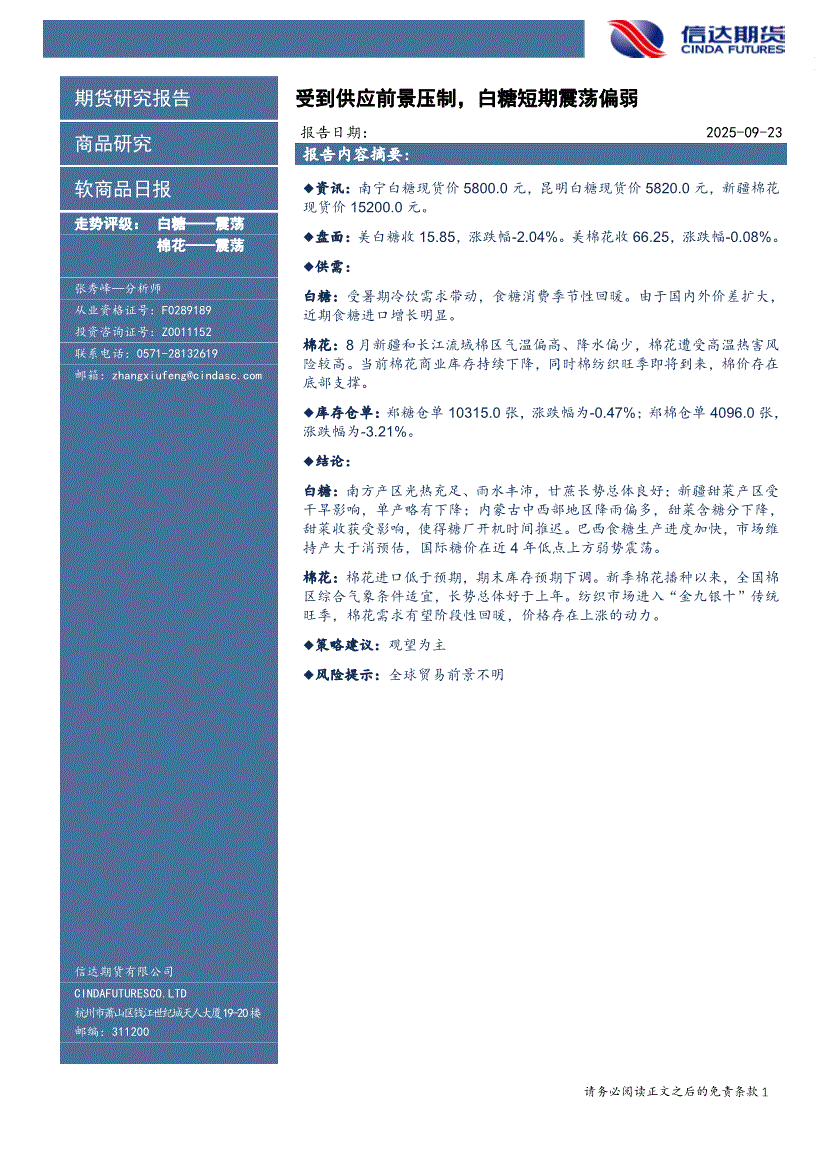 信达期货-软商品日报:受到供应前景压制,白糖短期震荡偏弱-250923