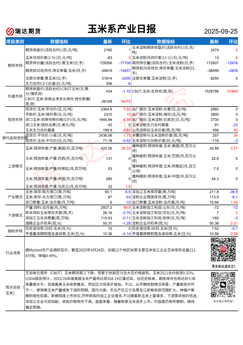 瑞达期货-玉米类市场周报:新季玉米上市增加,期价维持底部震荡-250926