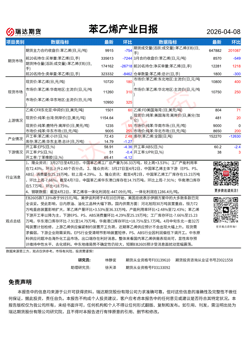 瑞达期货-苯乙烯产业日报-260408