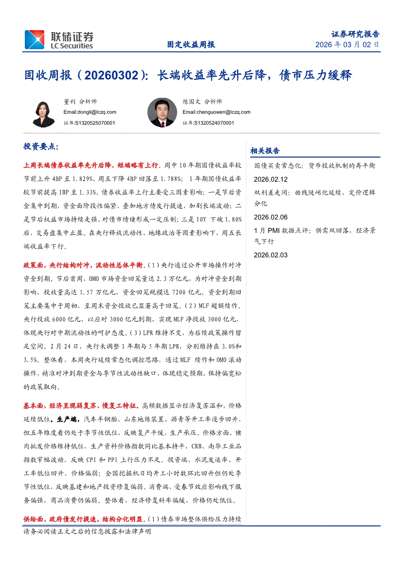 联储证券-固收周报:长端收益率先升后降,债市压力缓释-260302