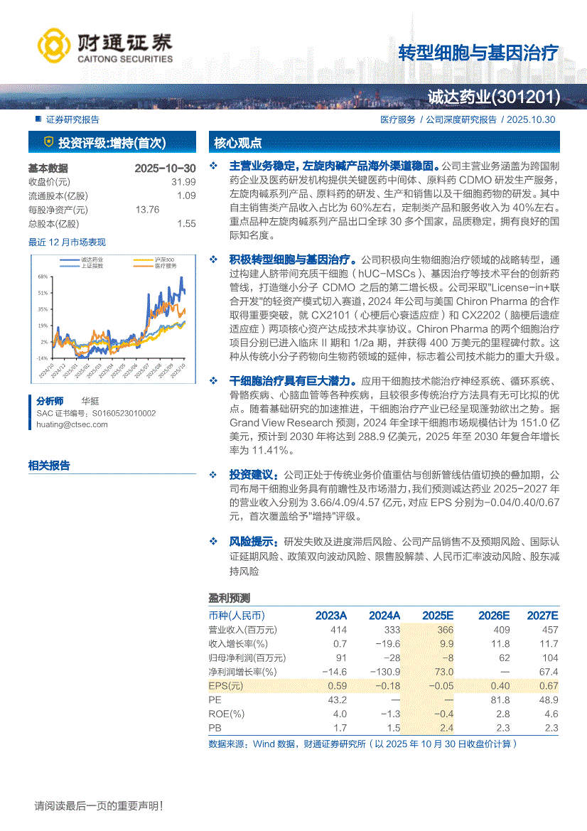 诚达药业:财通证券-诚达药业-301201-转型细胞与基因治疗-251030