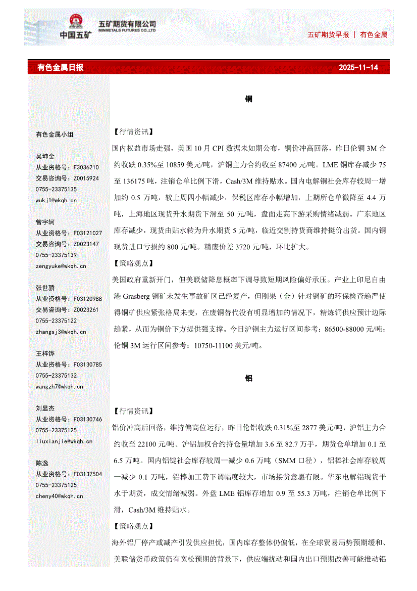 五矿期货-铜周报:情绪面有压力但预计冲击有限-251115
