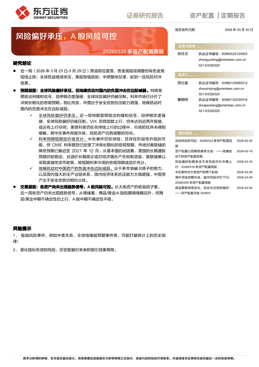 东方证券-多资产配置周报:风险偏好承压,A股风险可控-260330