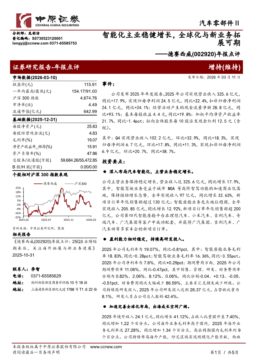 德赛西威:中原证券-德赛西威-002920-年报点评:智能化主业稳健增长,全球化与新业务拓展可期-260311