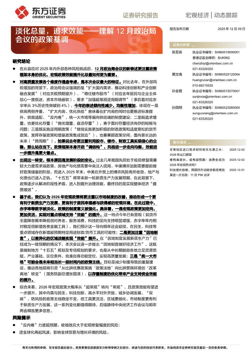 东方证券-理解12月政治局会议的政策基调:淡化总量,追求效能-251209