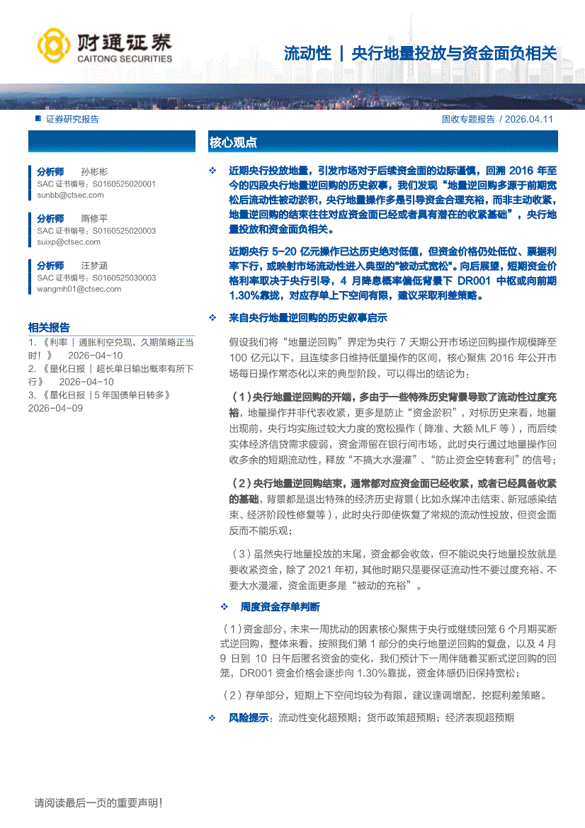 财通证券-流动性|央行地量投放与资金面负相关-260411