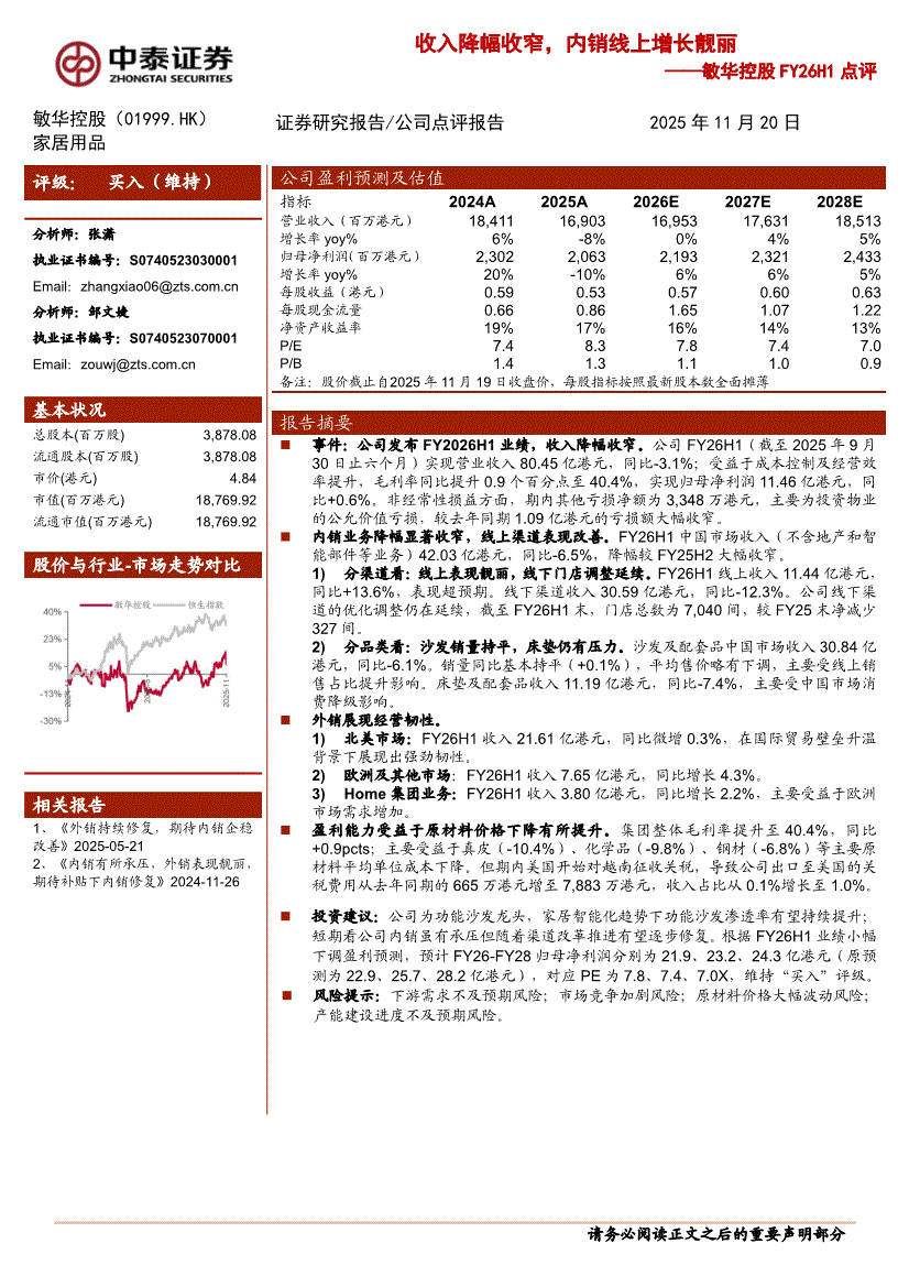 敏华控股:中泰证券-敏华控股-1999.HK-FY26H1点评:收入降幅收窄,内销线上增长靓丽-251120