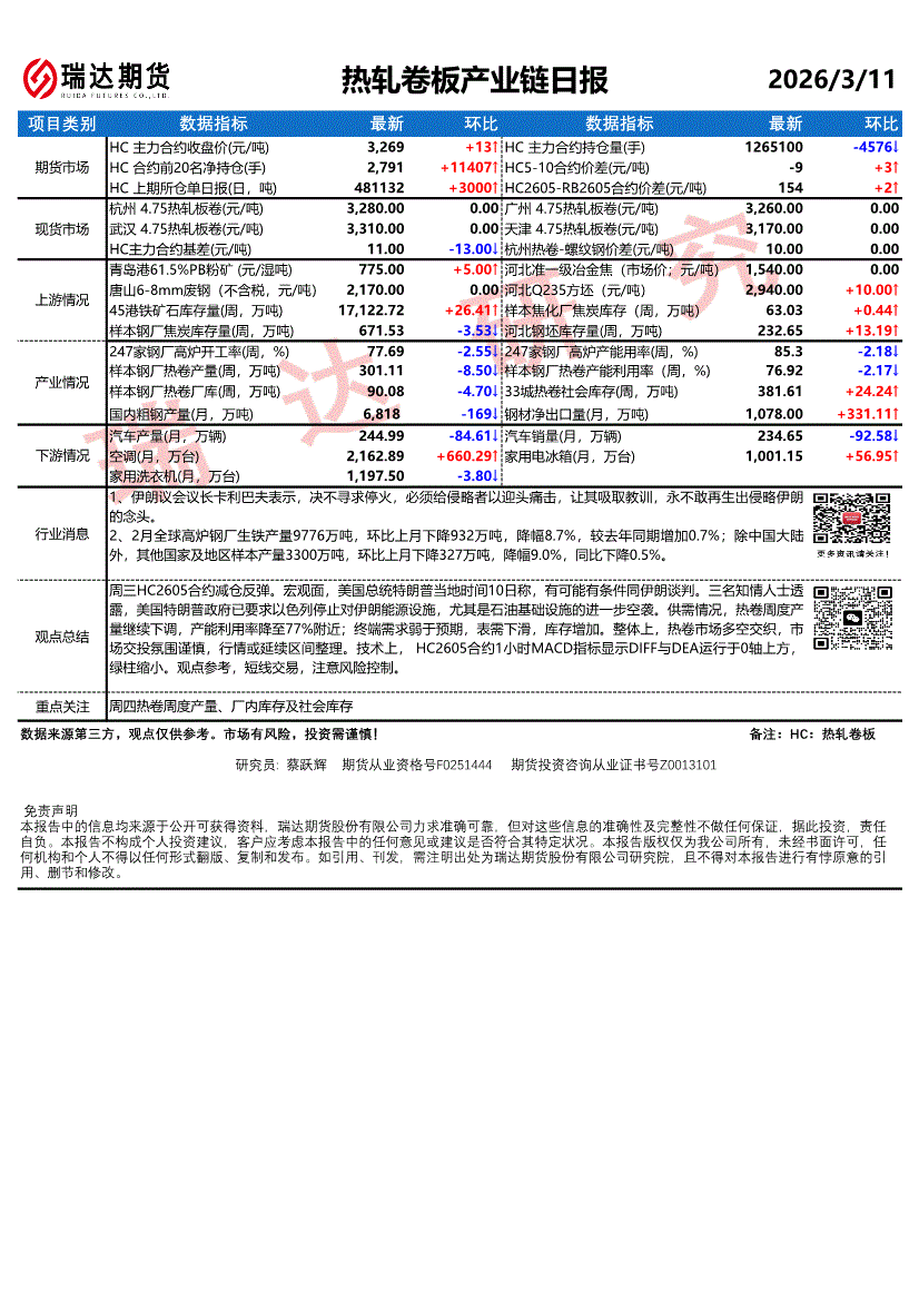 瑞达期货-热轧卷板产业链日报-260311