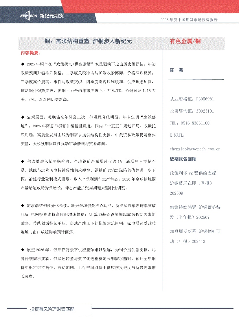 新纪元期货-铜:需求结构重塑,沪铜步入新纪元-251222