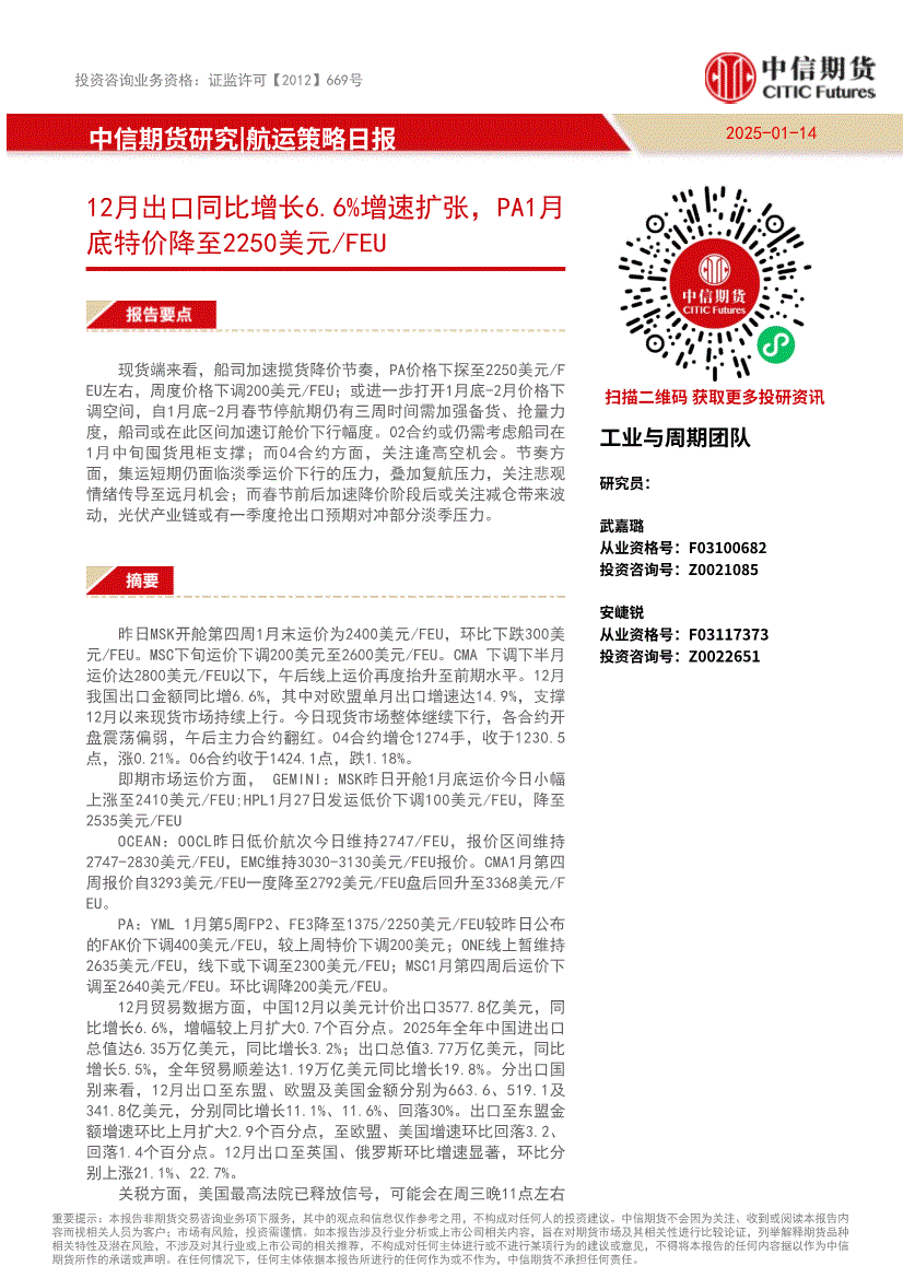 中信期货-航运策略日报:12月出口同比增长6.6%增速扩张,PA1月底特价降至2250美元/FEU-260114