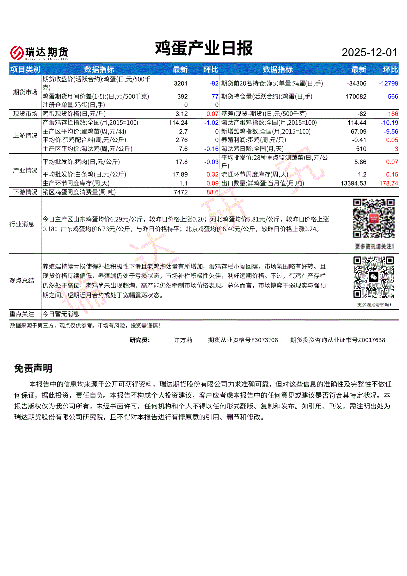 瑞达期货-鸡蛋产业日报-251201