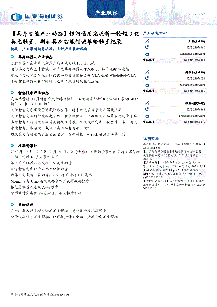 国泰海通证券-产业观察:【具身智能产业动态】银河通用完成新一轮超3亿美元融资,刷新具身智能领域单轮融资纪录-251222