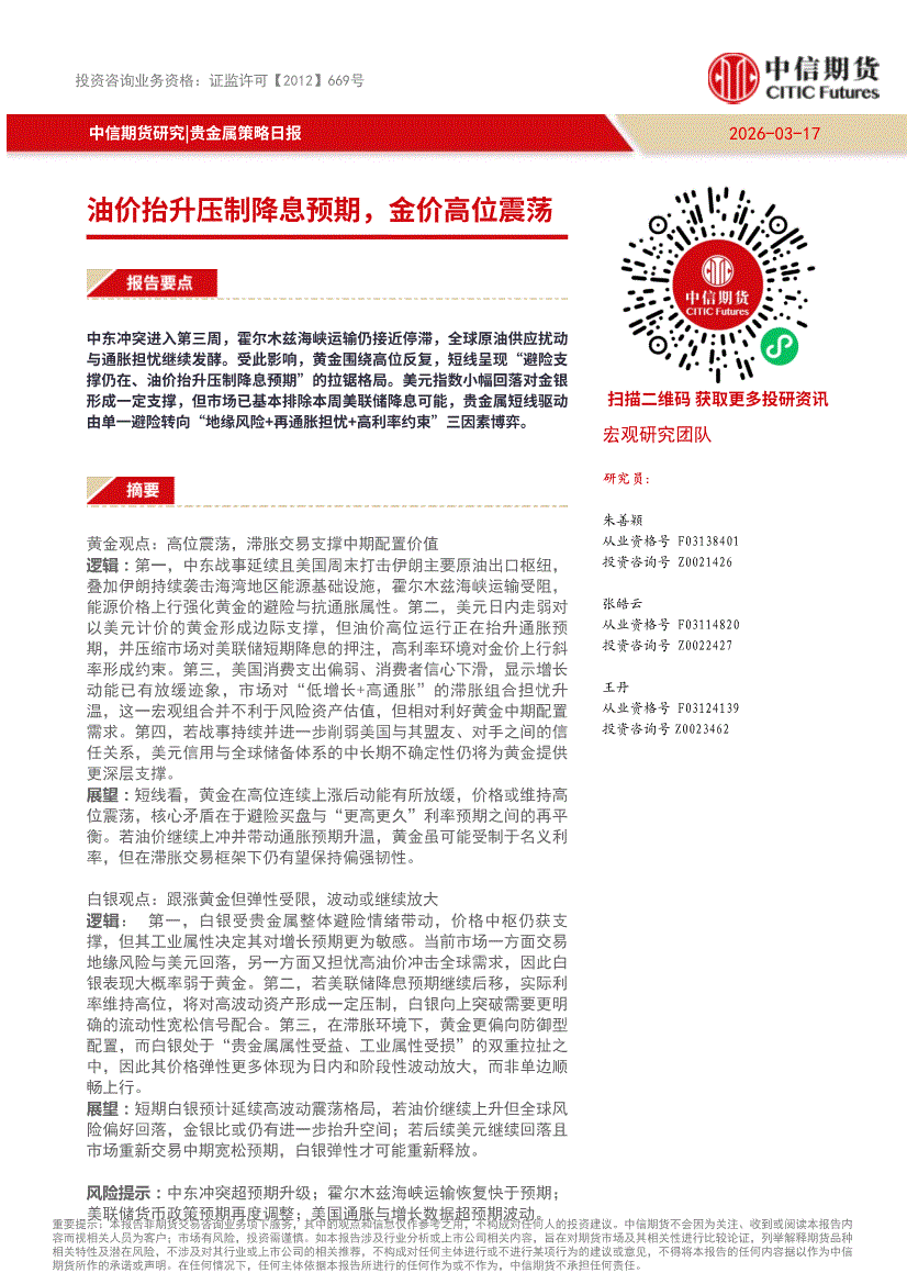 中信期货-贵金属策略日报:油价抬升压制降息预期,金价高位震荡-260317