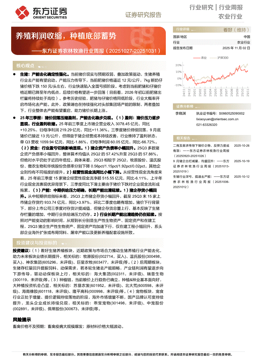 农林牧渔行业:东方证券-农林牧渔行业周报:养殖利润收缩,种植底部蓄势-251102