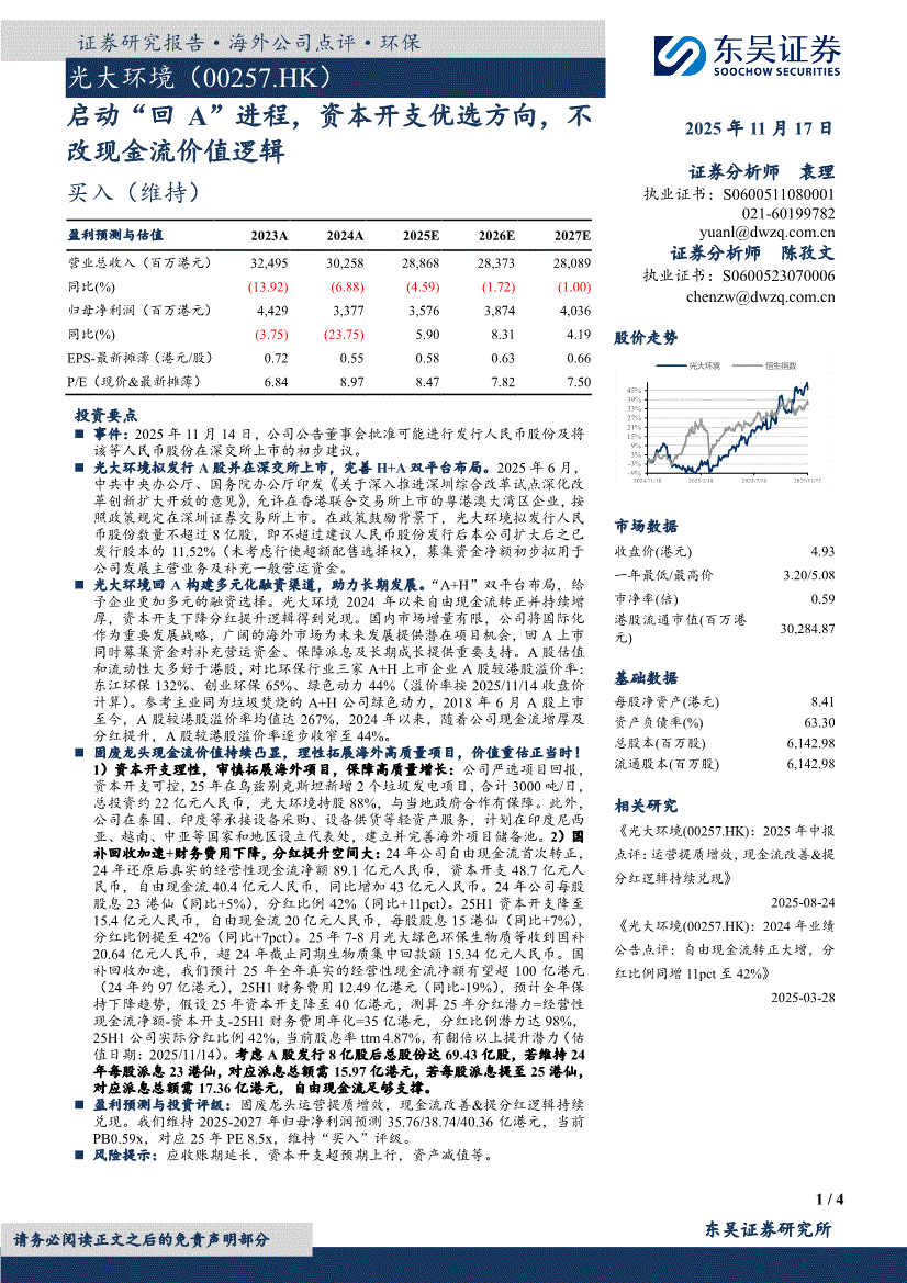 光大环境:东吴证券-光大环境-0257.HK-启动“回A”进程,资本开支优选方向,不改现金流价值逻辑-251117