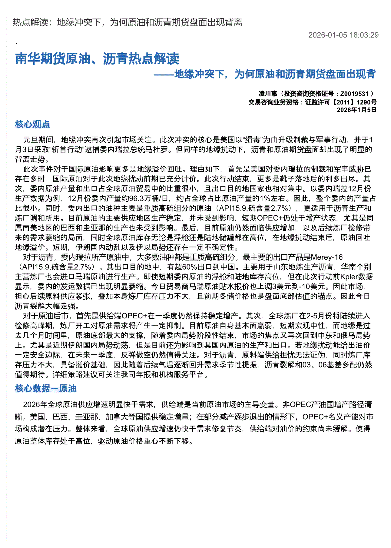 南华期货-原油、沥青热点解读:地缘冲突下,为何原油和沥青期货盘面出现背离-260105