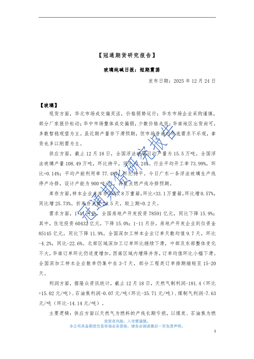 冠通期货-玻璃纯碱日报:短期震荡-251224