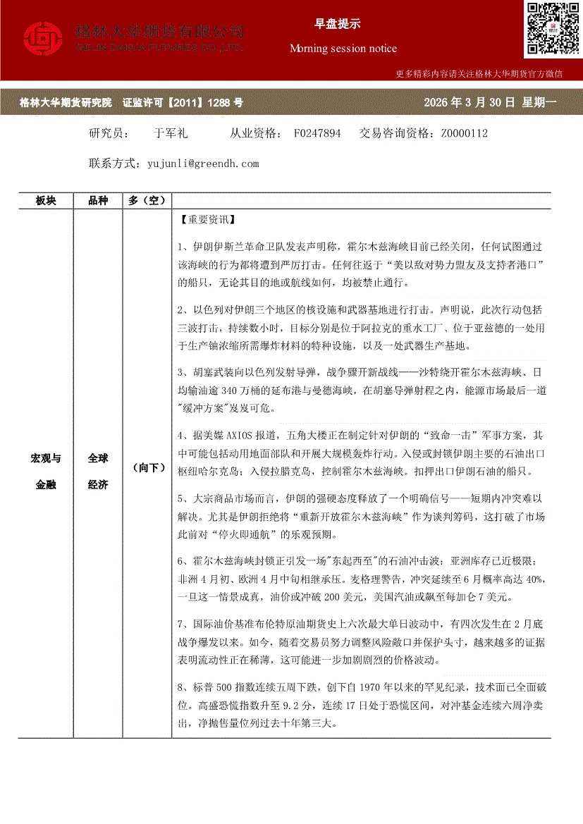 格林大华期货-早盘提示:宏观与金融-260330