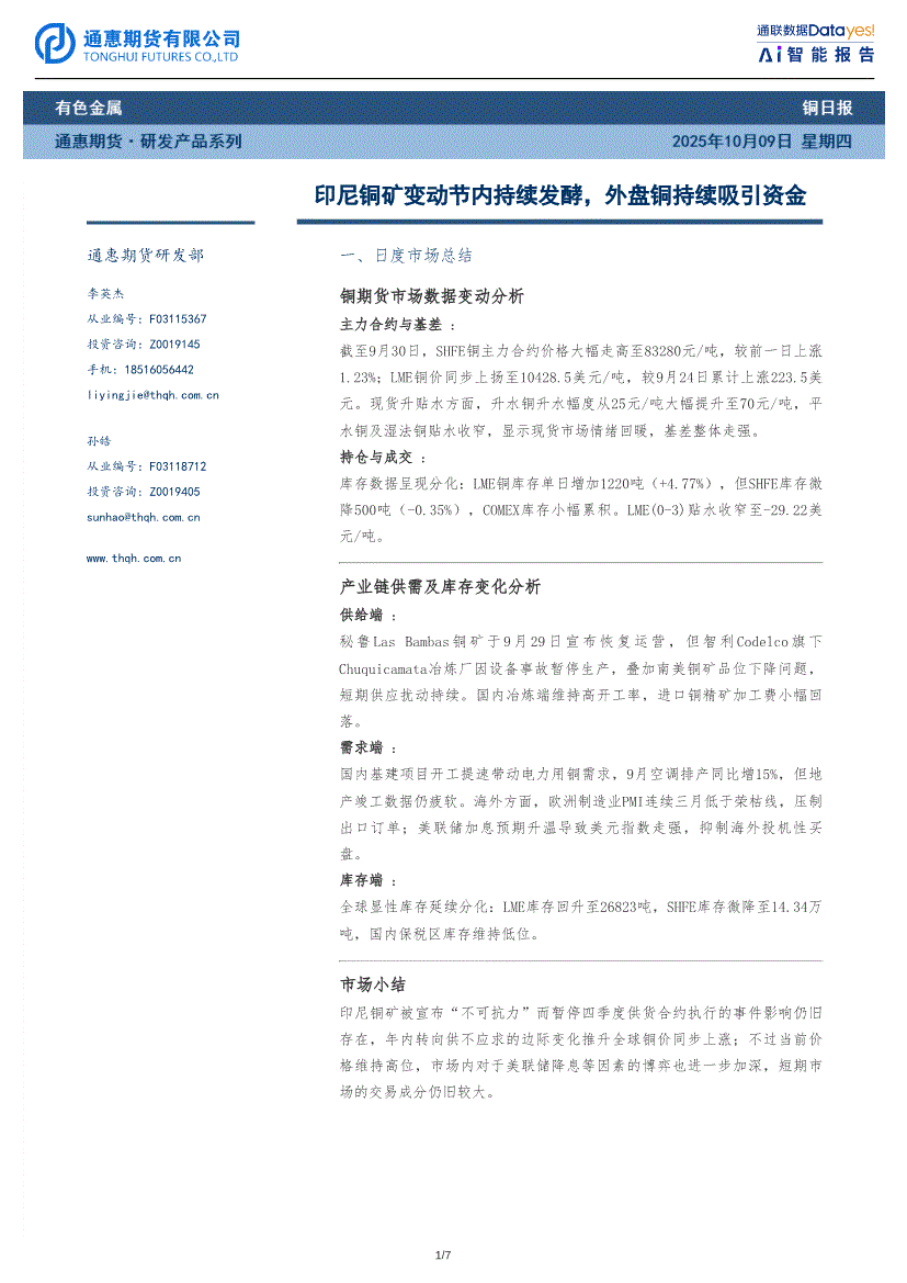 通惠期货-铜日报:印尼铜矿变动节内持续发酵,外盘铜持续吸引资金-251009