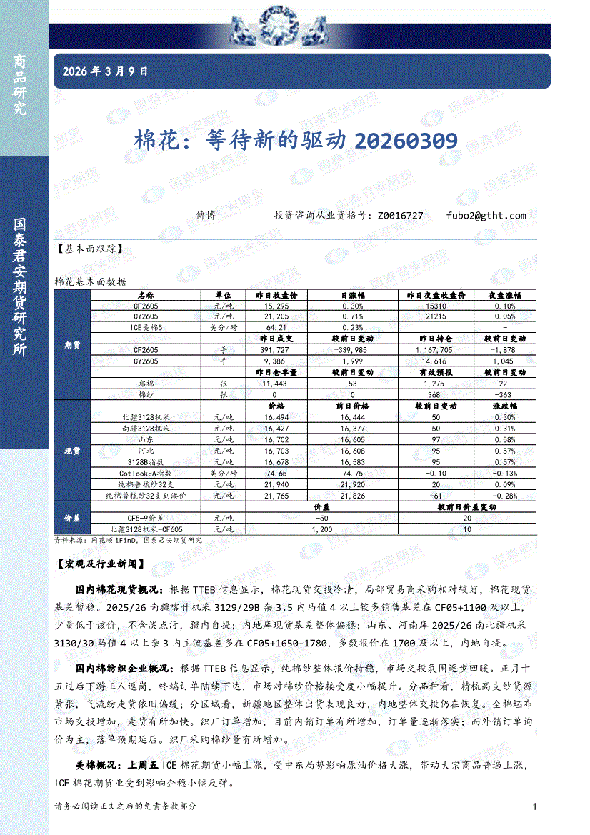 国泰君安期货-棉花:等待新的驱动-260309