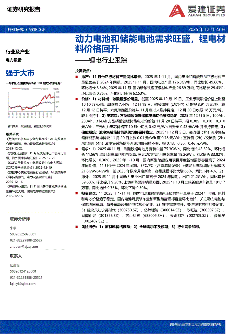 锂电行业:爱建证券-锂电行业跟踪:动力电池和储能电池需求旺盛,锂电材料价格回升-251223