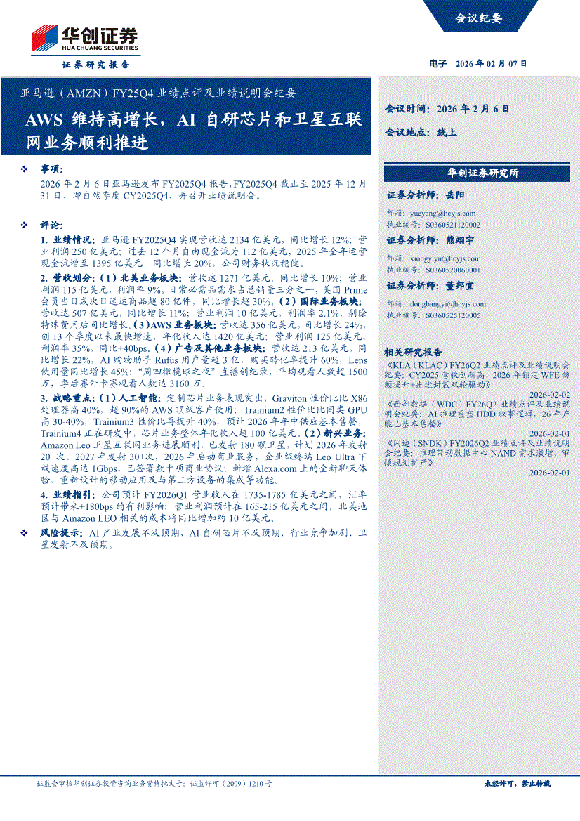 亚马逊:华创证券-亚马逊-AMZN.US-FY25Q4业绩点评及业绩说明会纪要:AWS维持高增长,AI自研芯片和卫星互联网业务顺利推进-260207