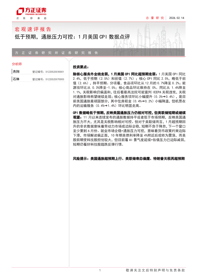 方正证券-宏观速评报告:低于预期,通胀压力可控,1月美国CPI数据点评-260214