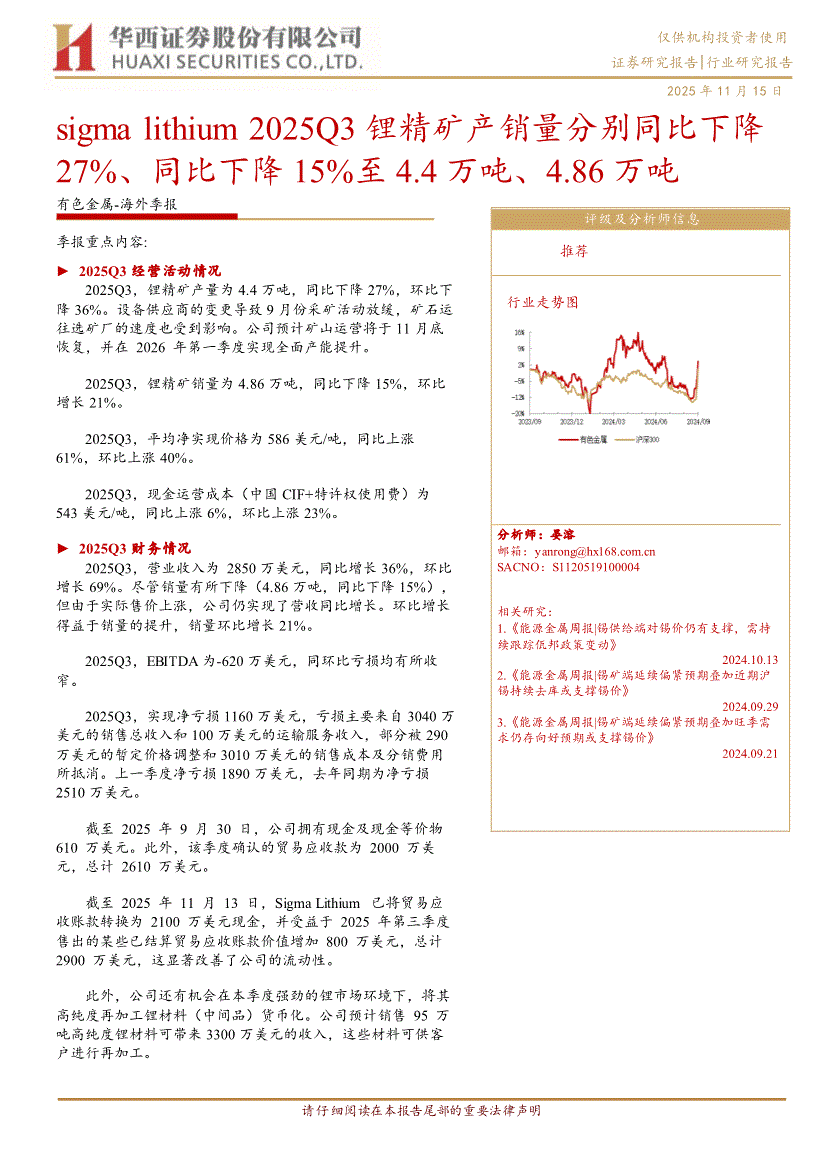 有色金属行业:华西证券-有色金属行业~海外季报:sigma lithium 2025Q3锂精矿产销量分别同比下降27%、同比下降15%至4.4万吨、4.86万吨-251115