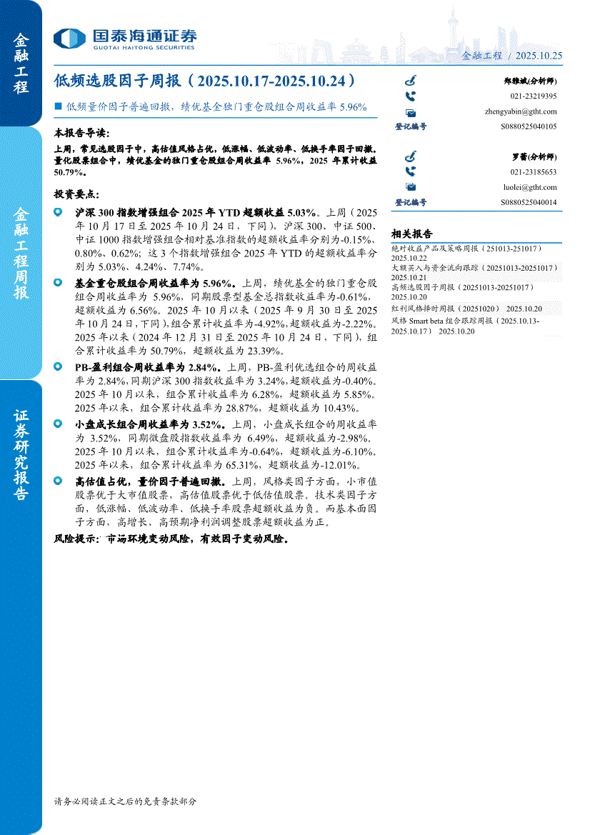 国泰海通证券-低频选股因子周报:低频量价因子普遍回撤,绩优基金独门重仓股组合周收益率5.96%-251025