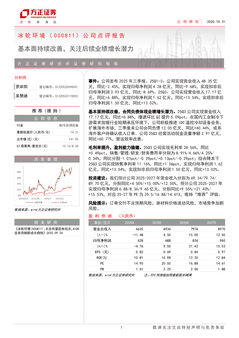 冰轮环境:方正证券-冰轮环境-000811-公司点评报告:基本面持续改善,关注后续业绩增长潜力-251031