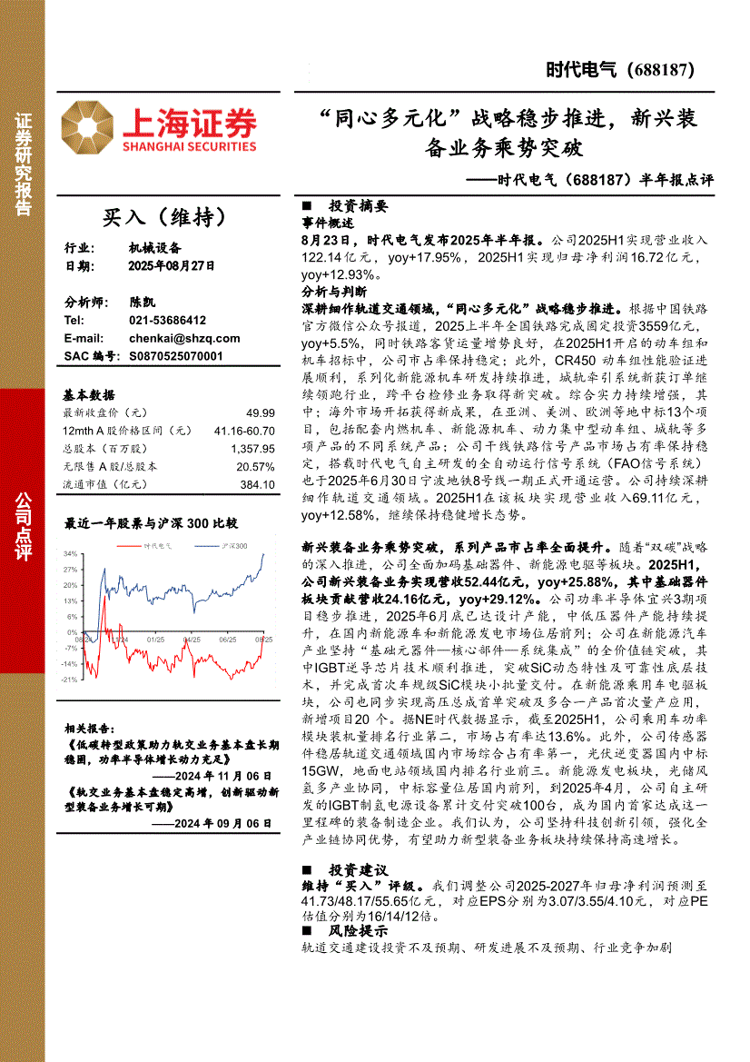 时代电气:上海证券-时代电气-688187-半年报点评 :“同心多元化”战略稳步推进,新兴装备业务乘势突破-250827