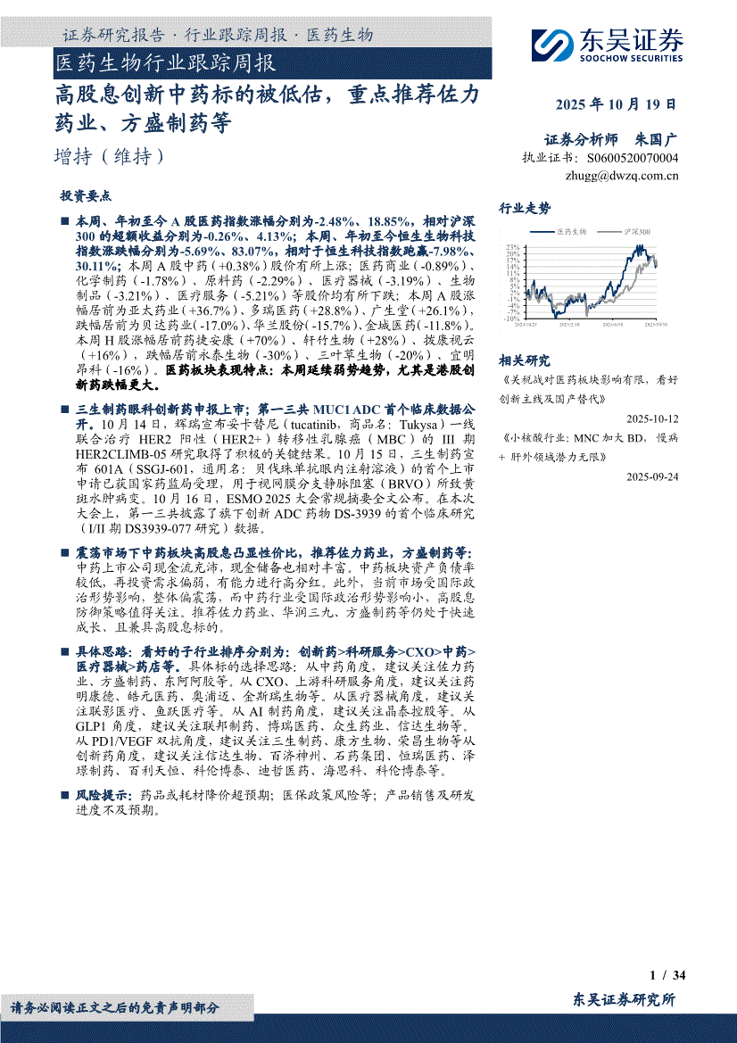医药生物行业:东吴证券-医药生物行业跟踪周报:高股息创新中药标的被低估,重点推荐佐力药业、方盛制药等-251019