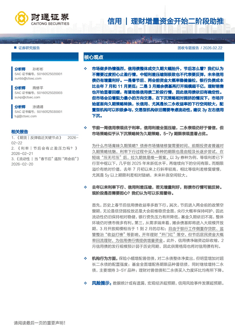 财通证券-信用|理财增量资金开始二阶段助推-260222