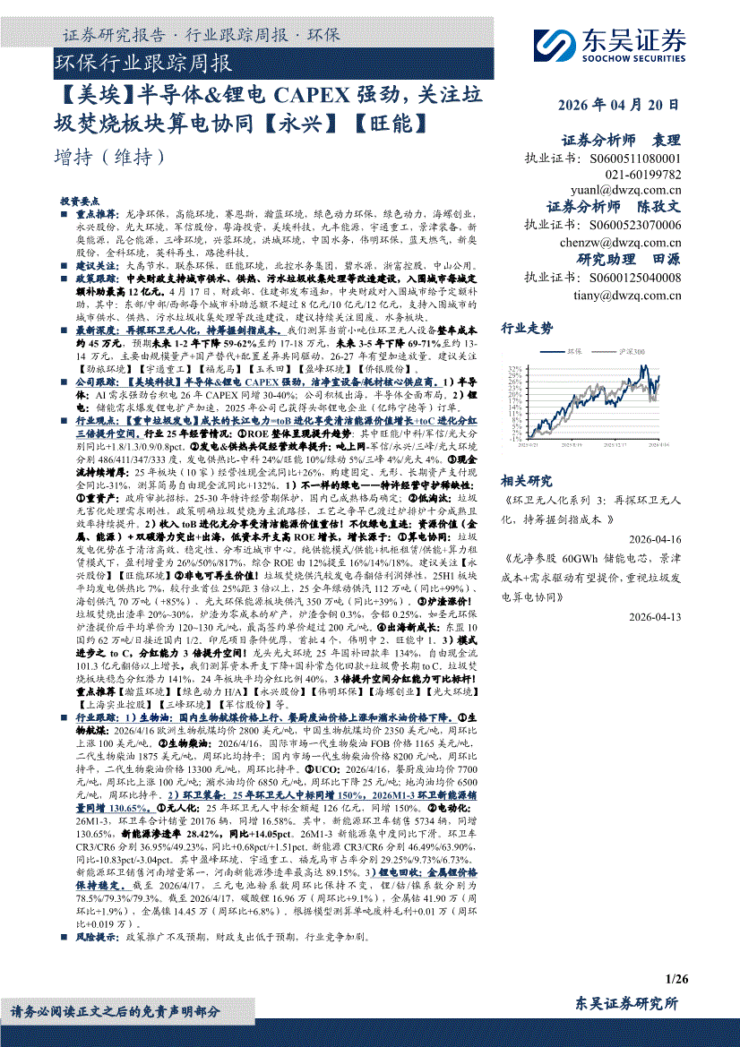 环保行业:东吴证券-环保行业跟踪周报:【美埃】半导体&锂电CAPEX强劲,关注垃圾焚烧板块算电协同【永兴】【旺能】-260420