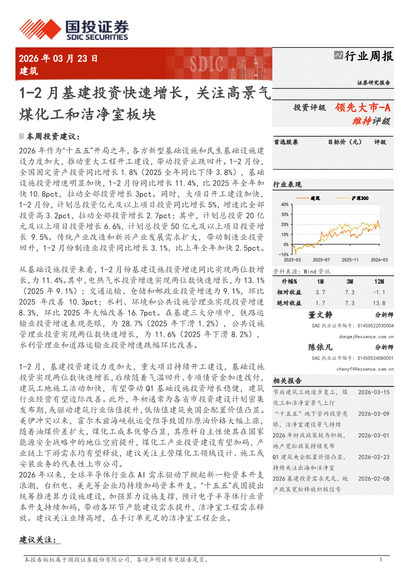 建筑行业:国投证券-建筑行业周报:1~2月基建投资快速增长,关注高景气煤化工和洁净室板块-260323