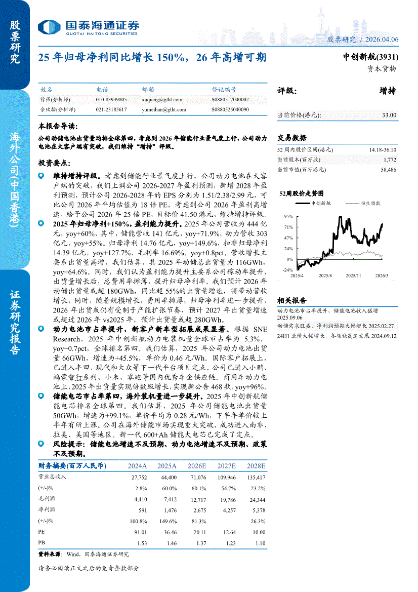 中创新航:国泰海通证券-中创新航-3931.HK-25年归母净利同比增长150%,26年高增可期-260406