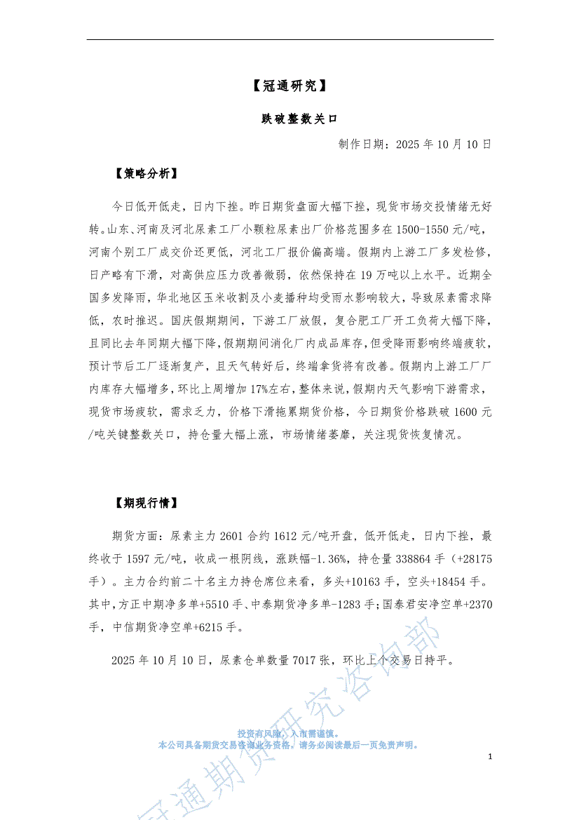 冠通期货-尿素周报:供需宽松,连续下挫-251013