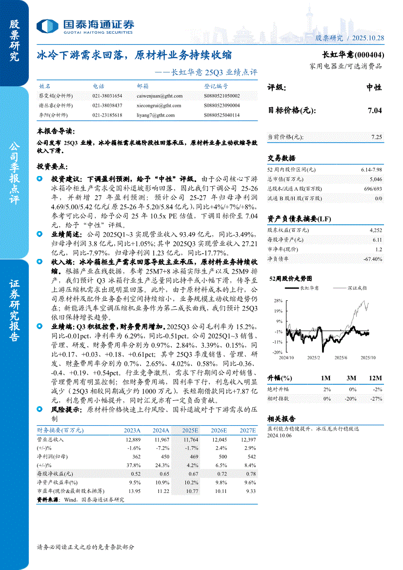长虹华意:国泰海通证券-长虹华意-000404-25Q3业绩点评:冰冷下游需求回落,原材料业务持续收缩-251028