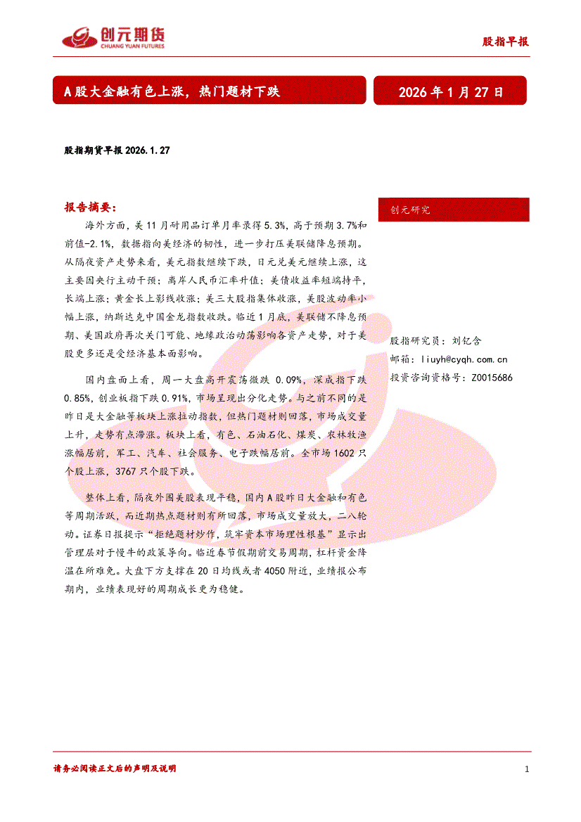 创元期货-股指早报:A股大金融有色上涨,热门题材下跌-260127
