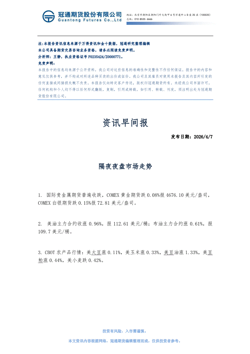 冠通期货-资讯早间报:隔夜夜盘市场走势-260407