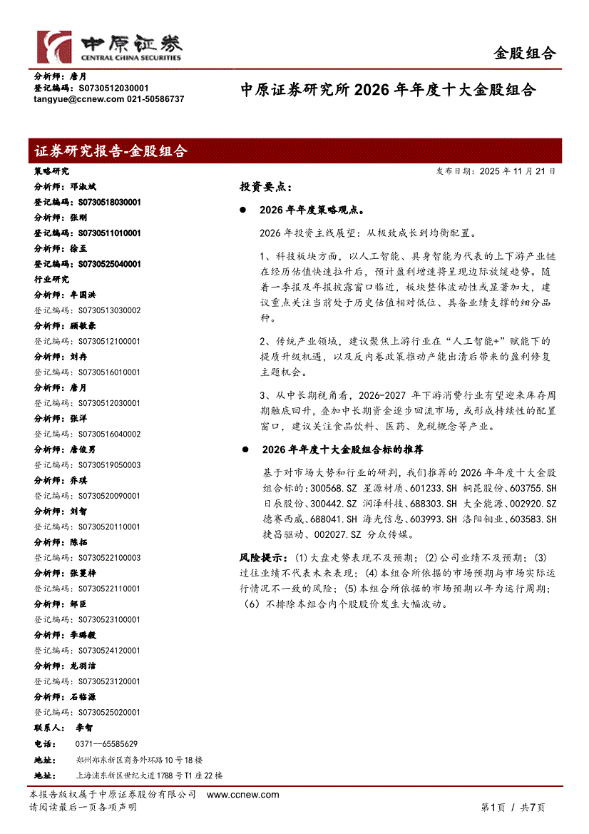 中原证券-研究所2026年年度十大金股组合-251121