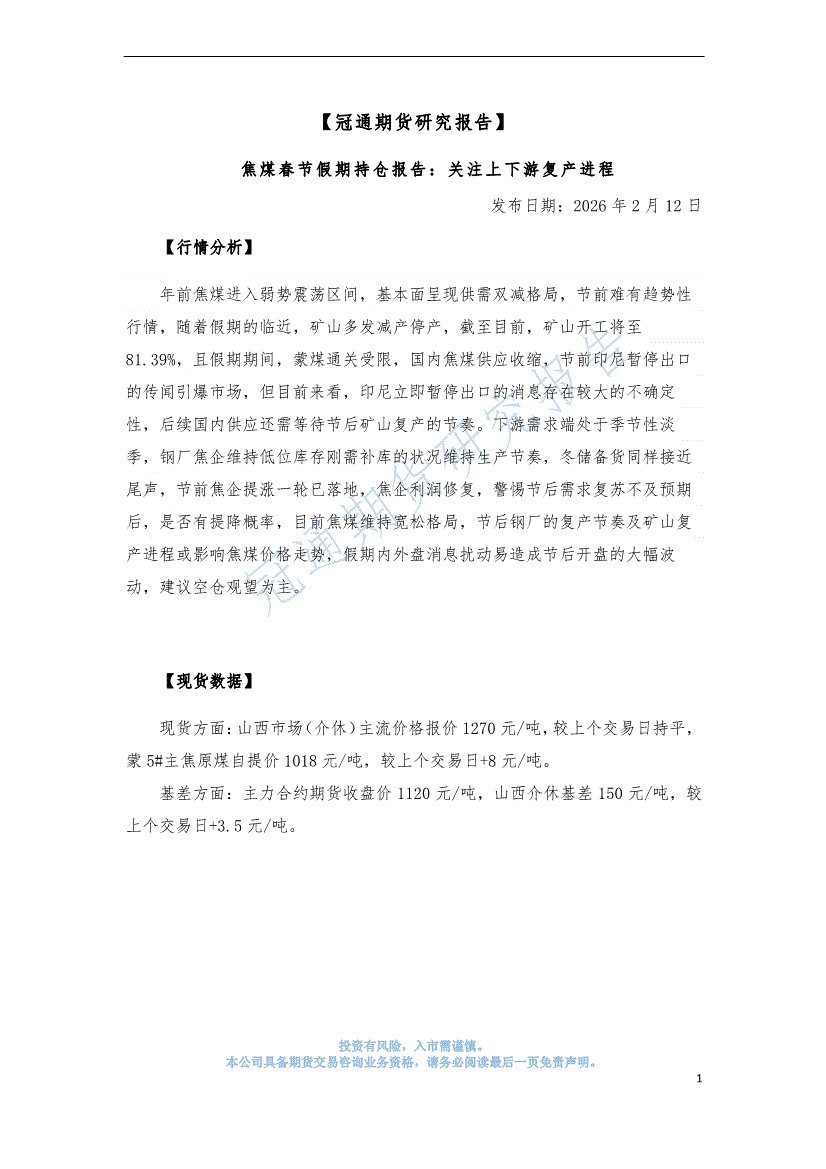 冠通期货-焦煤春节假期持仓报告:关注上下游复产进程-260212