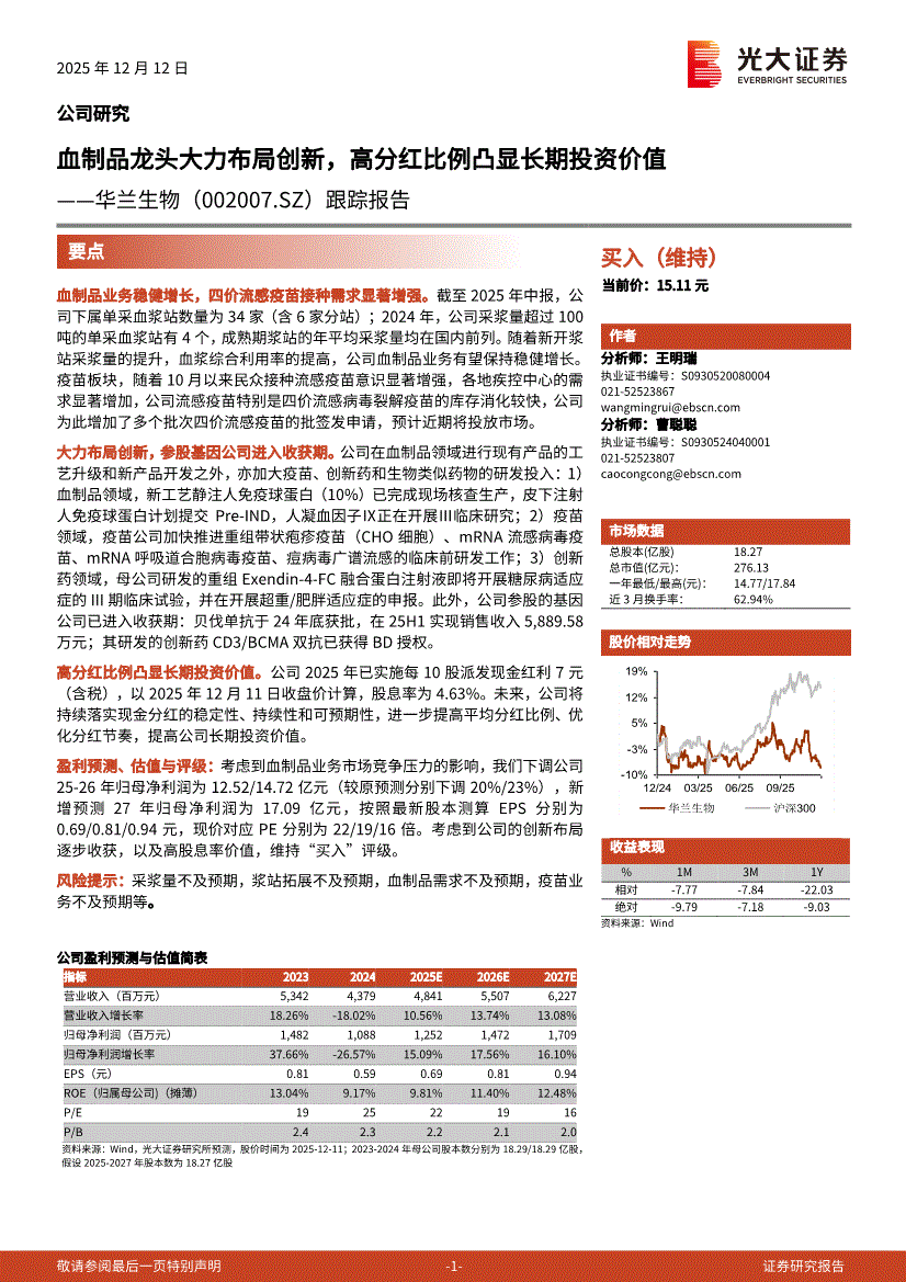 华兰生物:光大证券-华兰生物-002007-跟踪报告:血制品龙头大力布局创新,高分红比例凸显长期投资价值-251212